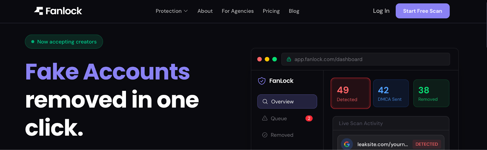 Fanlock targets persistent impersonation through multi-layered enforcement. The service monitors leak sites, Telegram channels (60 billion+ posts indexed), and social media for fake accounts. When takedown notices fail, Fanlock cuts revenue streams funding impersonation operations by escalating to advertising networks and payment processors. The platform leverages the Take It Down Act to enforce deepfake content, requiring platforms to remove AI-generated impersonations within 48 hours.