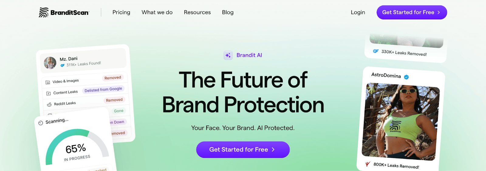 Branditscan uses facial recognition AI to identify content even when it is cropped, edited, or has watermarks removed. They scan 72,000+ websites hourly with a claimed 98.7% detection rate.